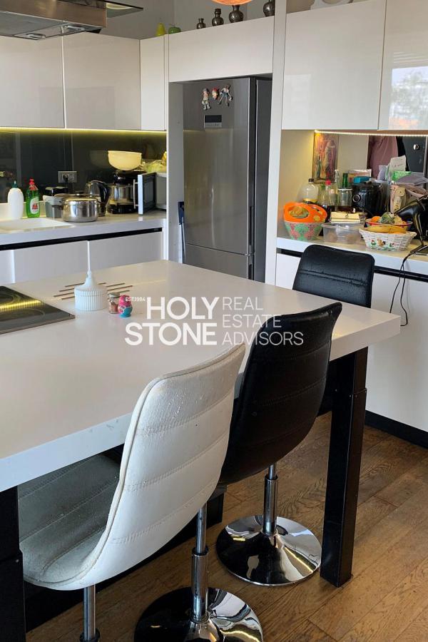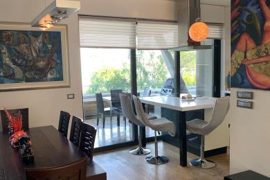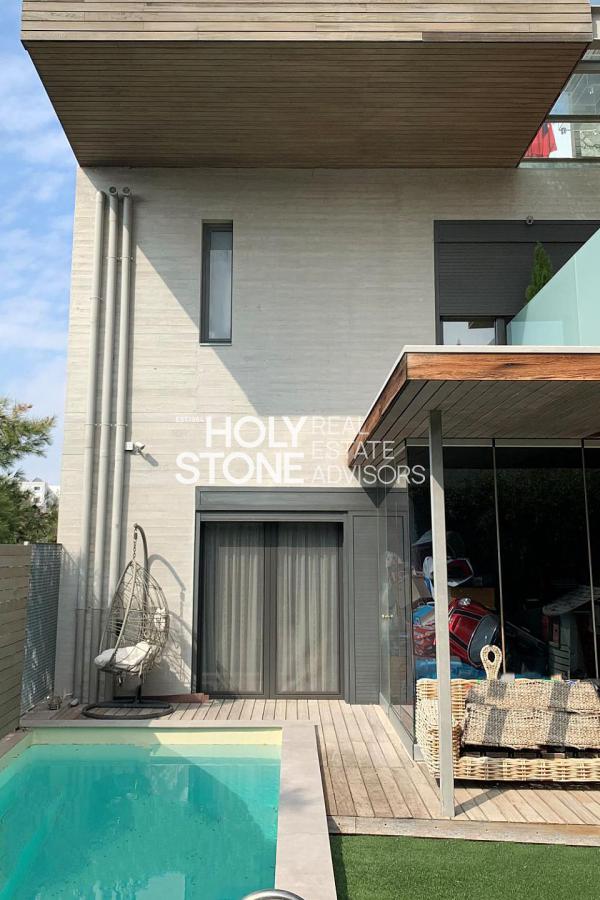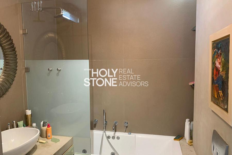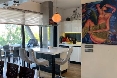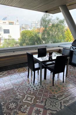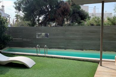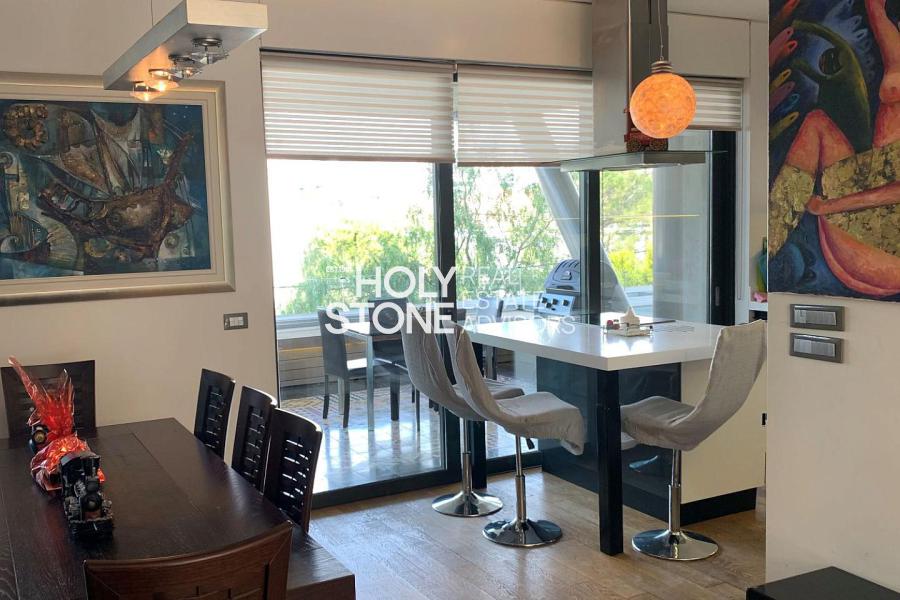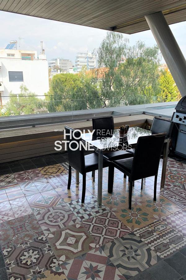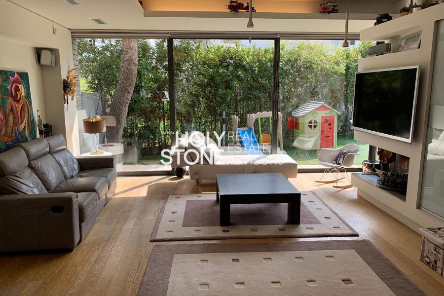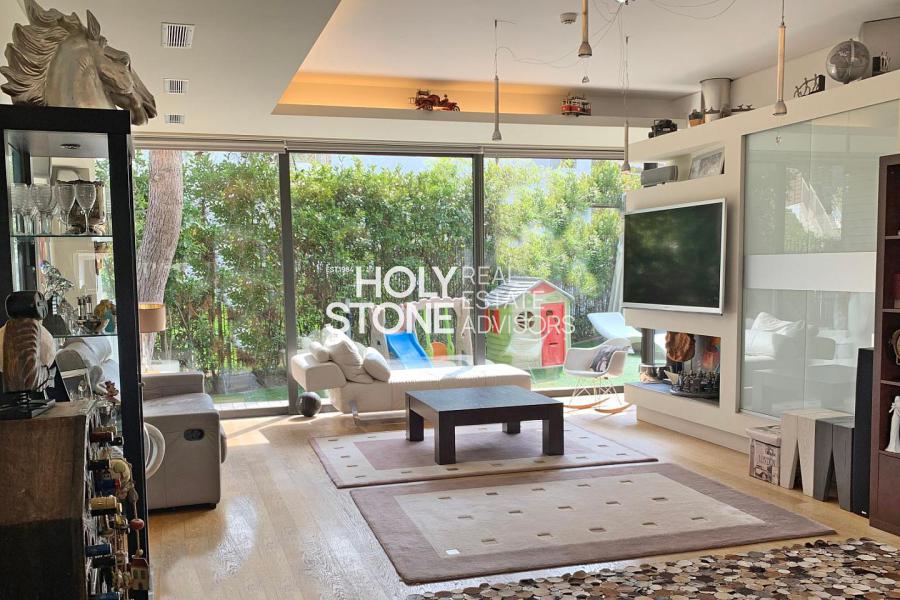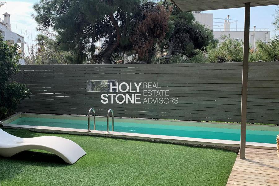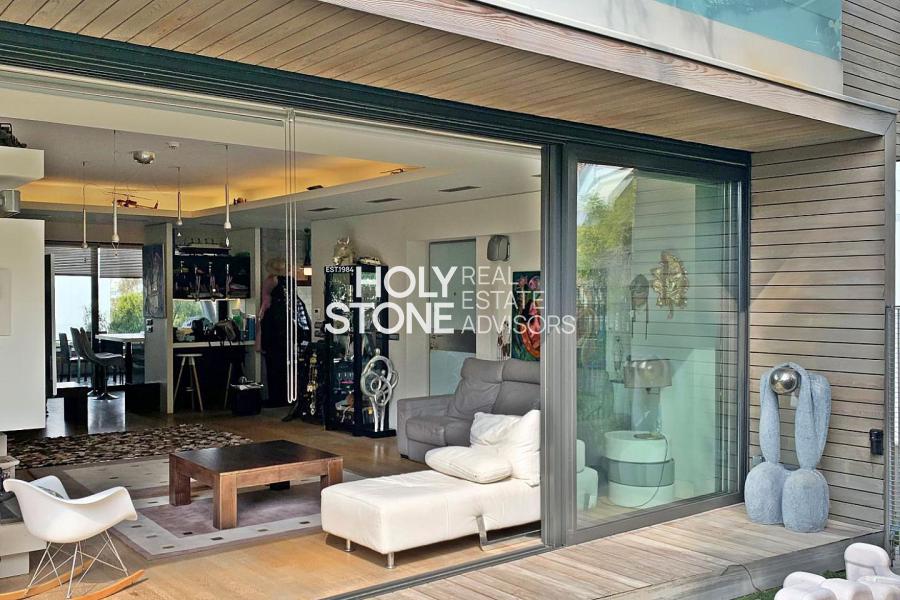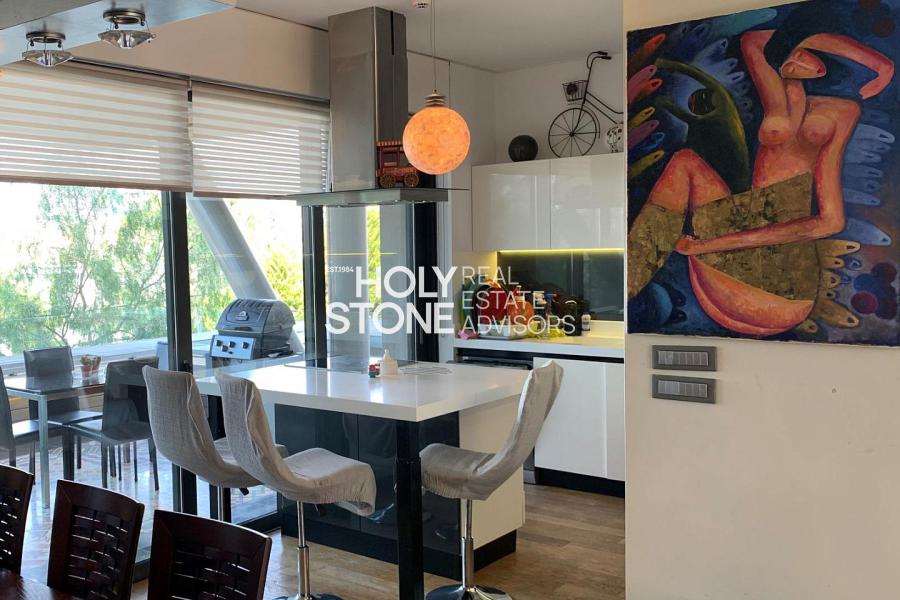 'Αλιμος (Πανί), Πολυτελές οροφοδιαμέρισμα 127τ.μ, 1ου ορόφου, μοναδικής minimal αρχιτεκτονικής, με πλήρη ιδιωτικότητα, σε μία από τις ωραιότερες γειτονιές του Αλίμου, με καταπράσινο κήπο και πισίνα, άνετο σαλόνι με τζάκι, open plan μοντέρνα κουζίνα με νησίδα, τραπεζαρία, 2 υπνοδωμάτια (το ένα en-suite), 1 γραφείο/έξτρα δωμάτιο, 2 μπάνια, τζακούζι, ενδοδαπέδια θέρμανση, σύστημα VRV, στεγασμένα μεγάλα μπαλκόνια, 2 θέσεις στάθμευσης υπογείου, αποθήκη. Ιδανική πρόταση για μοντέρνο ζευγάρι που αναζητά άνεση, απέριττη πολυτέλεια και ποιότητα ζωής.