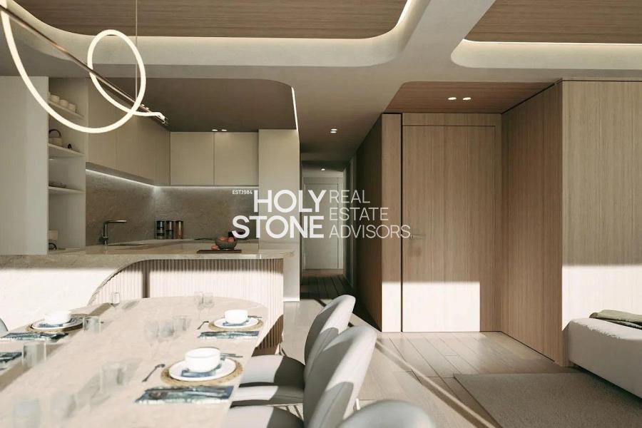 Διαθέτει open-plan κουζίνα-τραπεζαρία-σαλόνι, 3 υπνοδωμάτια και 2 μπάνια. Την περιγραφή του μοναδικού αυτού ακινήτου ενισχύει η αριστοτεχνική σύνδεση του εσωτερικού με τον εξωτερικό εξώστη, δημιουργώντας έναν τεράστιο, φωτεινό χώρο που συμβάλει στην πολυτέλεια της διαβίωσης. Τις ανέσεις συμπληρώνουν αποθήκη 12τ.μ και μια θέση στάθμευσης στο υπόγειο. Το κτίριο προβλέπεται να είναι κατηγορίας A++, με συστήματα VRP A/C και ενδοδαπέδια θέρμανση. Αναμενόμενη αποπεράτωση Νοέμβριος 2025.