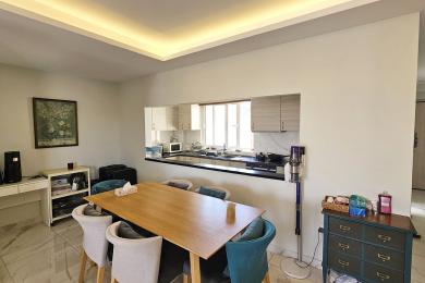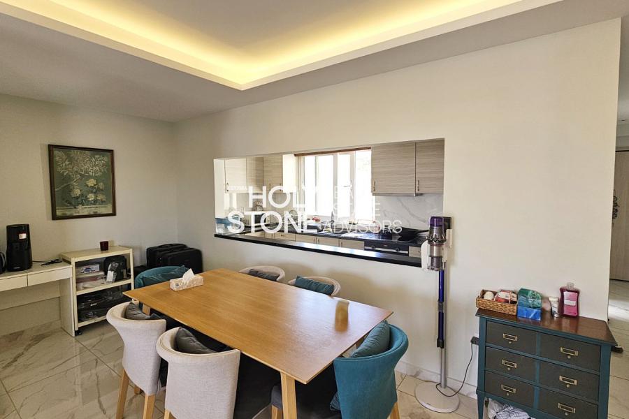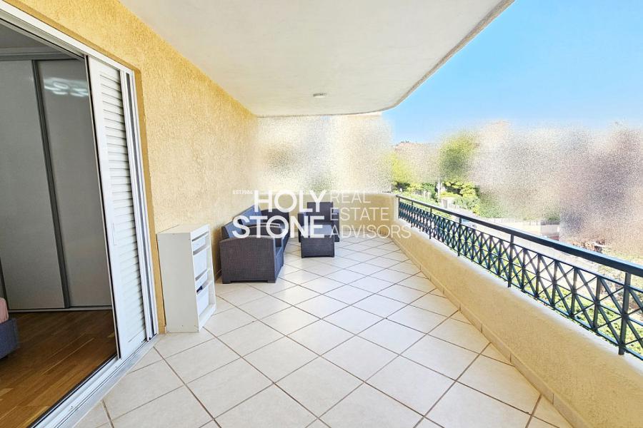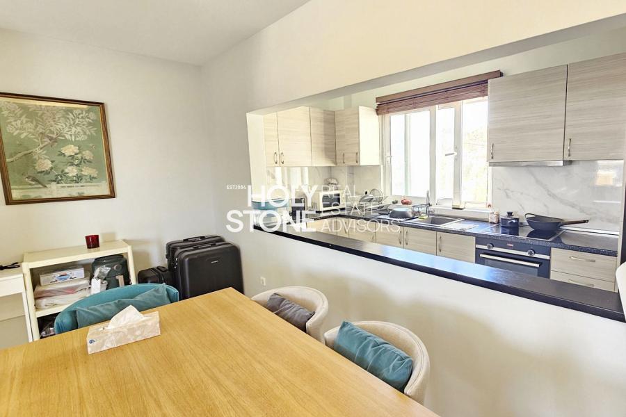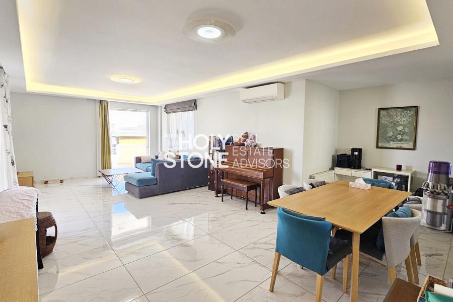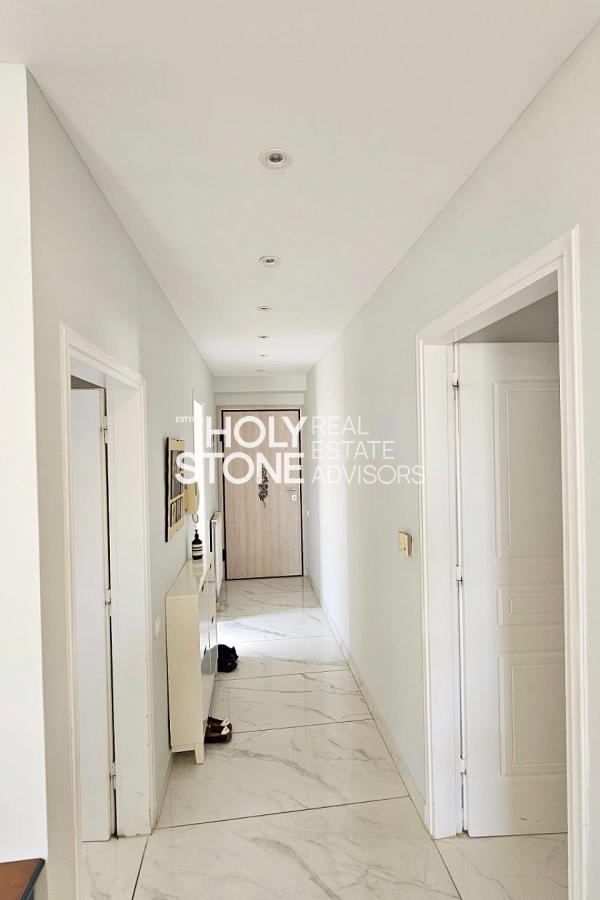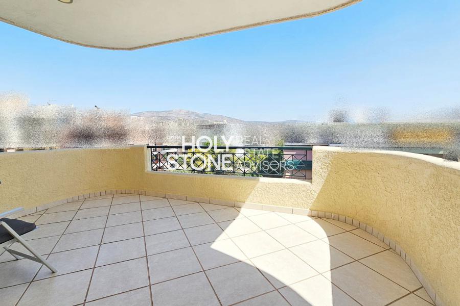 Το διαμέρισμα αποτελείται από έναν ευρύχωρο καθιστικό με πρόσβαση σε άνετη βεράντα και θέα στο βουνό και μερική θέα στη θάλασσα, ιδανική για οικογενειακές συγκεντρώσεις ή στιγμές χαλάρωσης. Η κουζίνα είναι ενιαία με το σαλόνι και διαθέτει πάσο, ενώ είναι πλήρως εξοπλισμένη με ηλεκτρικές συσκευές. Περιλαμβάνει τρία υπνοδωμάτια, εκ των οποίων το ένα είναι master με ιδιωτικό μπάνιο (en suite), ένα επιπλέον μπάνιο που εξυπηρετεί τα υπόλοιπα δωμάτια, καθώς και ένα wc επισκεπτών, ενω δεν απουσίαζει και ο επιπλέον χώρος που φιλοξενεί το πλυντήριο / στεγνωτήριο.