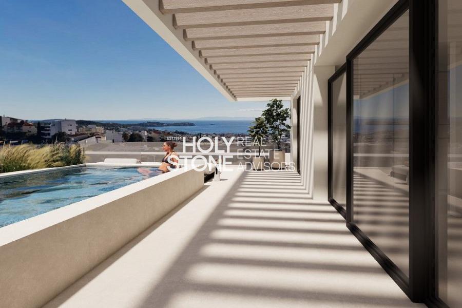 Η κορύφωση της εμπειρίας αποκαλύπτεται στον χώρο της πισίνας, στον τελευταίο όροφο, όπου το βλέμμα χάνεται στο γαλάζιο της θάλασσας. Ο χώρος περιλαμβάνει kitchenette και wc, εξυπηρετώντας ιδανικά στιγμές χαλάρωσης, διασκέδασης και απόλυτης ιδιωτικότητας.