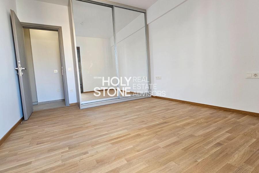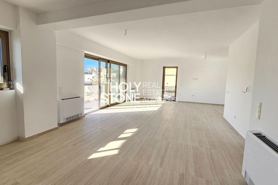 Ο χώρος υποδοχής περιλαμβάνει ανοιχτό σαλόνι και τραπεζαρία, τα οποία επικοινωνούν αρμονικά με την κουζίνα, η οποία δεν έχει τοποθετηθεί και μπορεί να σχεδιαστεί σύμφωνα με τις ανάγκες του νέου ιδιοκτήτη. Από εδώ υπάρχει πρόσβαση σε ένα ευρύχωρο μπαλκόνι που προσφέρει όμορφη θέα προς το αστικό τοπίο, ιδανικό για στιγμές χαλάρωσης ή φιλοξενία.