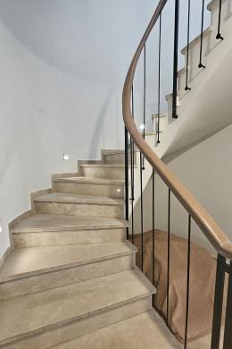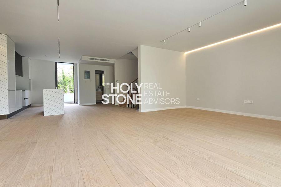 Στο ισόγειο συναντά κανείς την είσοδο και την κεντρική σκάλα που οδηγεί στους κυρίως χώρους. Ο πρώτος όροφος φιλοξενεί ένα ηλιόλουστο και ευρύχωρο σαλόνι, το οποίο ενώνεται αρμονικά με την open-plan κουζίνα και ανοίγει σε ένα όμορφο, άνετο μπαλκόνι. Στο ίδιο επίπεδο υπάρχει ένα WC, καθώς και ένας επιπλέον χώρος που μπορεί να αξιοποιηθεί ως laundry room ή pantry, ανάλογα με τις ανάγκες του νέου ιδιοκτήτη.