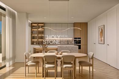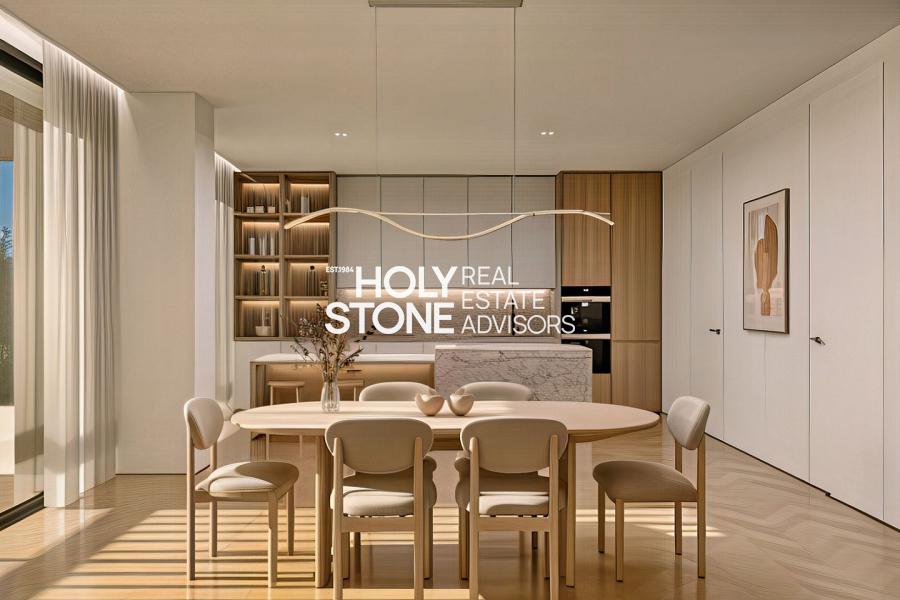Η κομψή κουζίνα ανοιχτού τύπου με την τραπεζαρία οργανώνεται γύρω από μια εντυπωσιακή, μεγάλων διαστάσεων νησίδα, η οποία λειτουργεί ως stylish breakfast bar αλλά και ως φυσικό σημείο συνάντησης για την καθημερινότητα και τη φιλοξενία επισκεπτών.