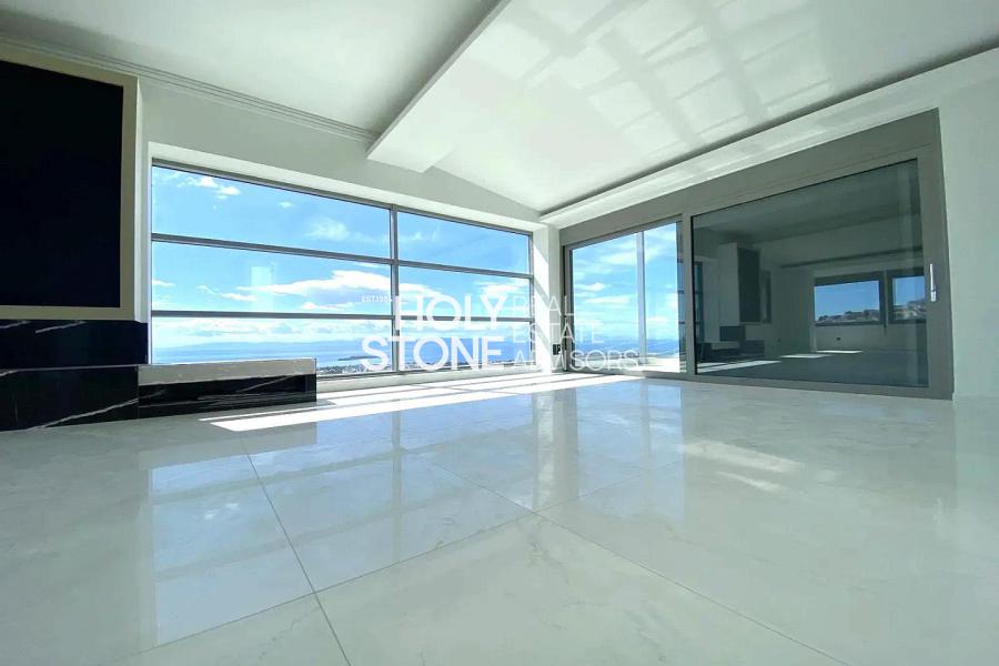 - Επίπεδο 2: Μεγάλος ενιαίος χώρος σαλόνι–τραπεζαρία με open plan κουζίνα και πανοραμική θέα 270° — ιδανικός για ψυχαγωγία και κοινωνικές στιγμές.