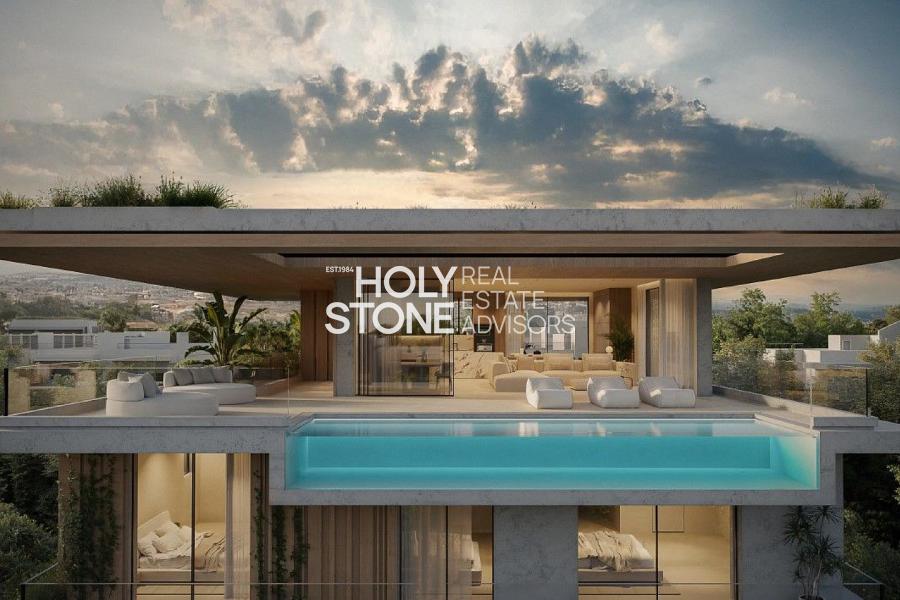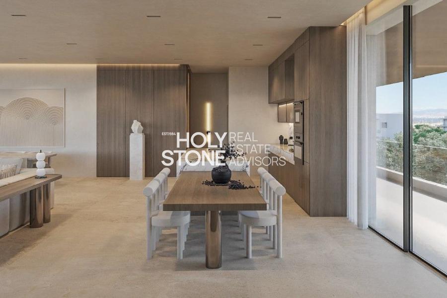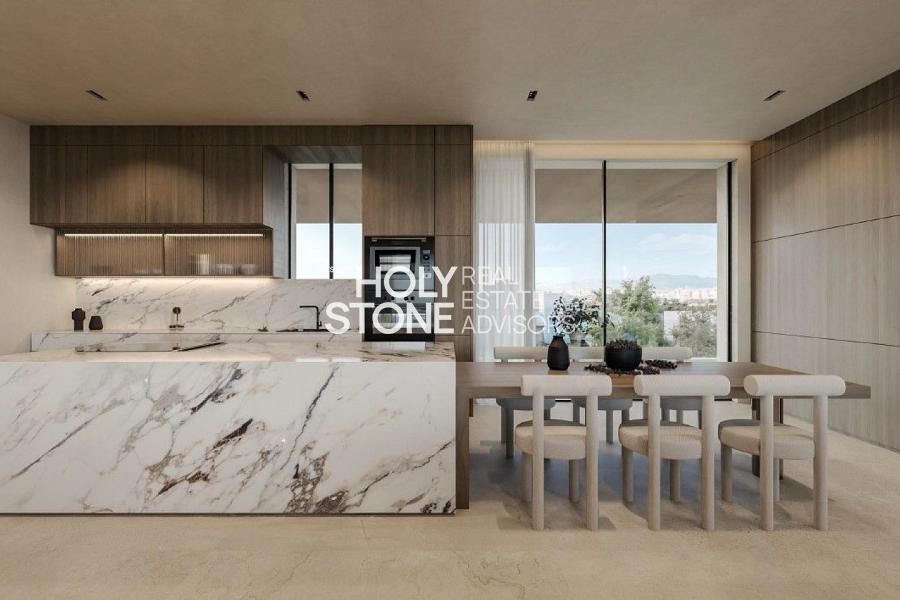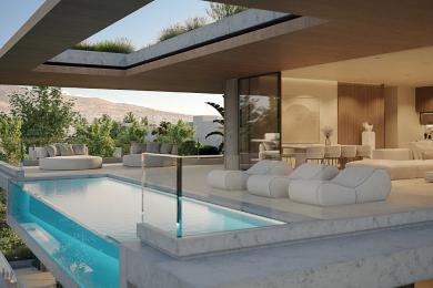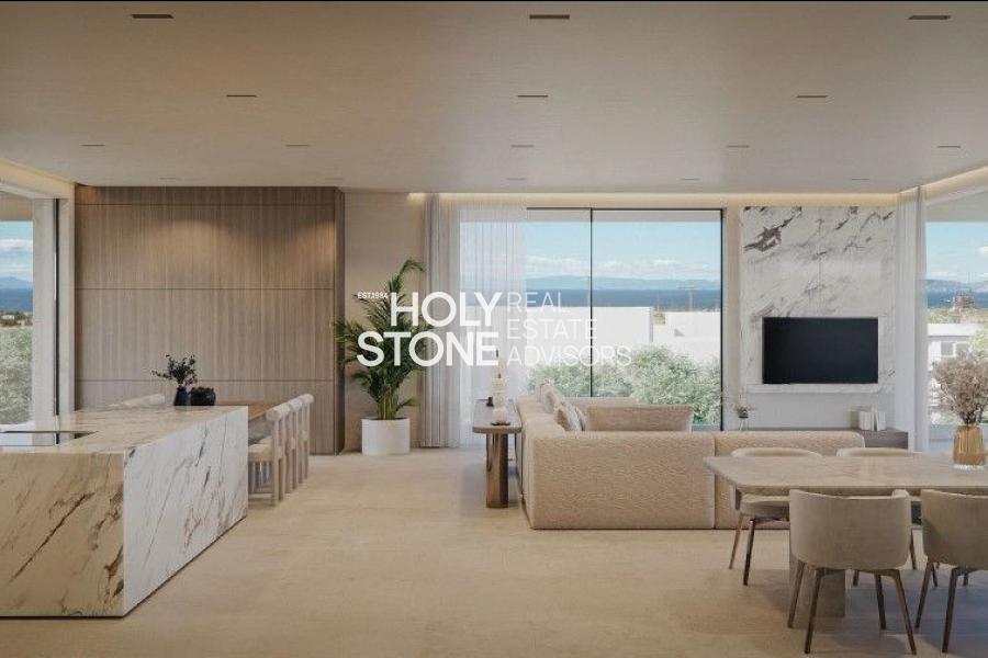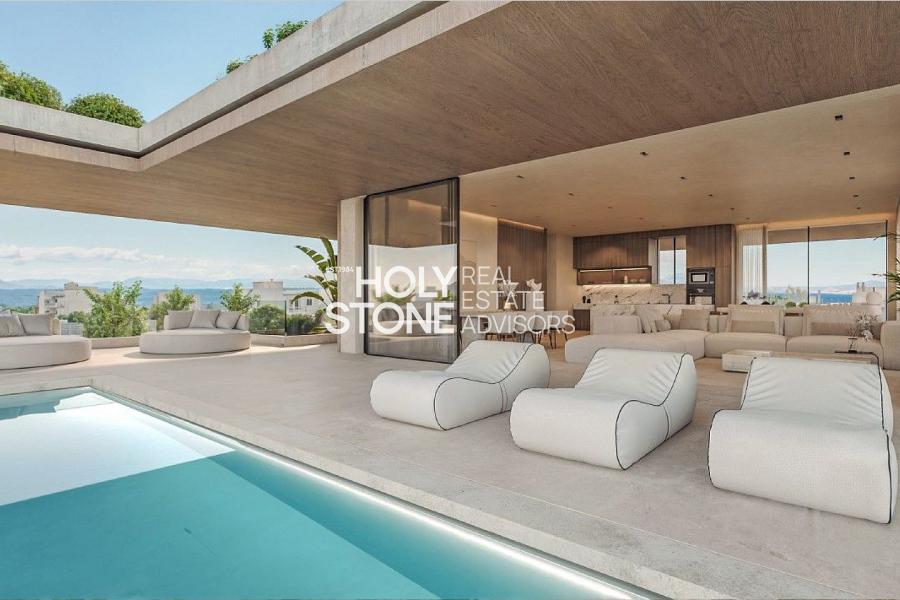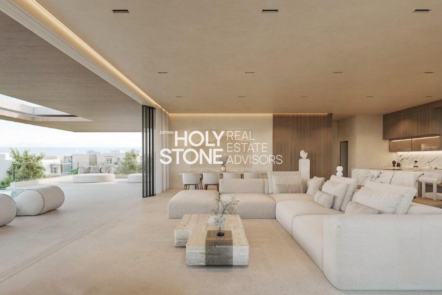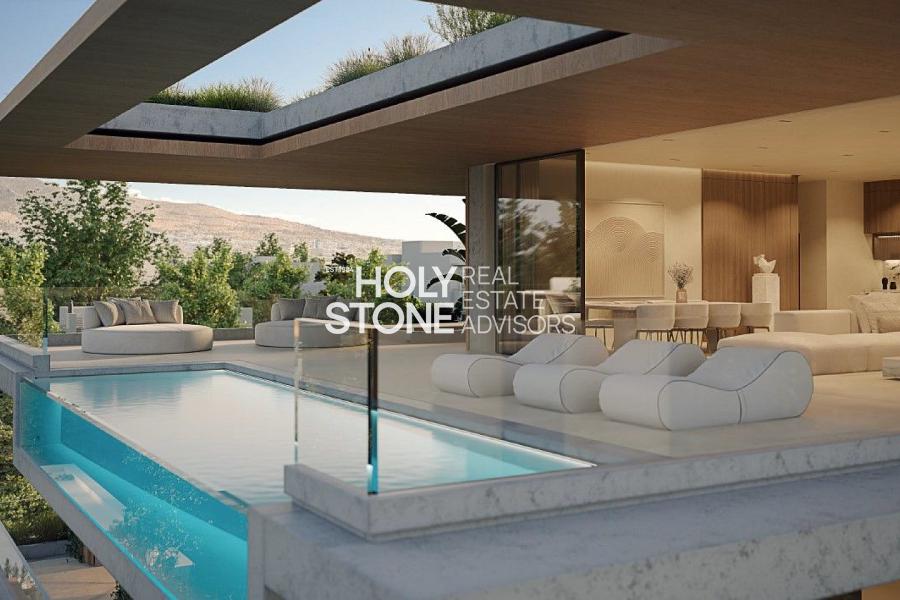 Αναπτύσσεται σε δύο επίπεδα και σχεδιάστηκε για να προσφέρει απόλυτη ιδιωτικότητα και ανεμπόδιστη ροή φωτός. Στο ανώτερο επίπεδο, ο ενιαίος χώρος κουζίνας, τραπεζαρίας και σαλονιού ανοίγει σε μια εντυπωσιακή βεράντα, όπου δεσπόζει η ιδιωτική πισίνα 26 τ.μ.. Από εκεί, η θέα προς τη Γλυφάδα και το απέραντο γαλάζιο του Σαρωνικού δημιουργεί ένα σκηνικό απαράμιλλης αισθητικής και ηρεμίας.