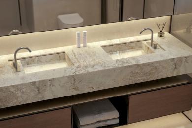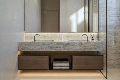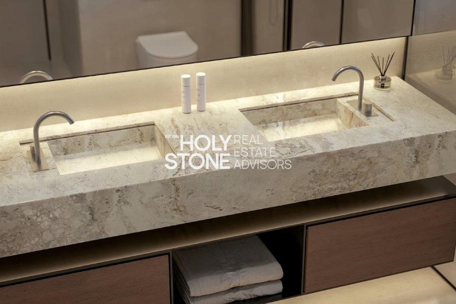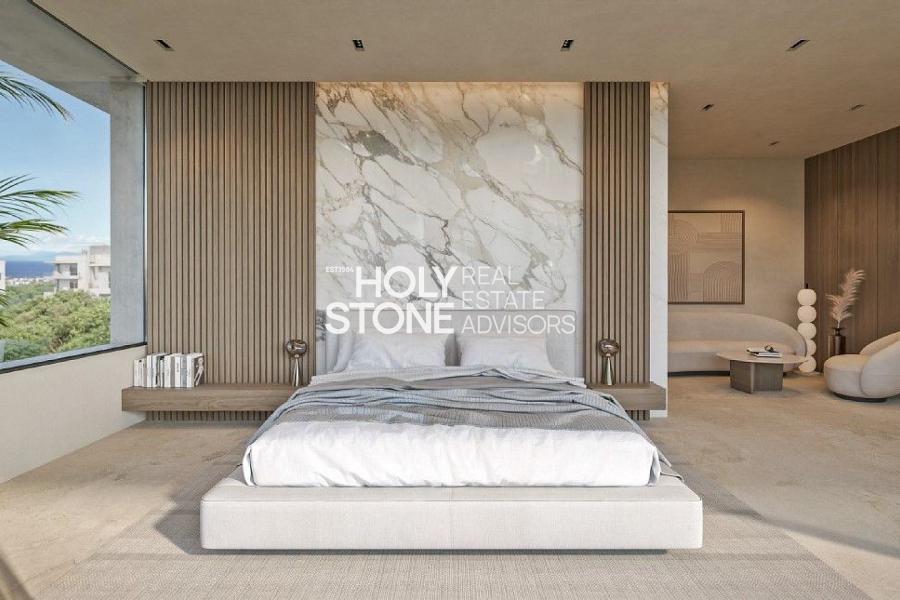 Το κατώτερο επίπεδο φιλοξενεί τέσσερα υπνοδωμάτια en suite, όλα με κομψές λεπτομέρειες και προσεγμένο σχεδιασμό, προσφέροντας έναν απόλυτα προσωπικό χώρο χαλάρωσης. Η κατοικία διαθέτει επίσης ανεξάρτητο χώρο laundry, που ενισχύει τη λειτουργικότητα της καθημερινότητας χωρίς να διαταράσσει τη ροή του χώρου.