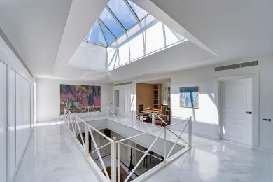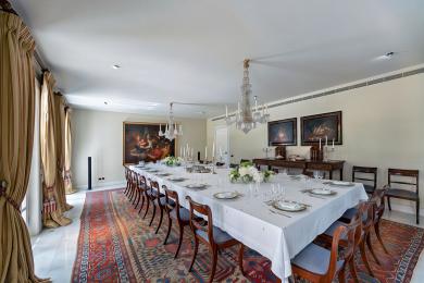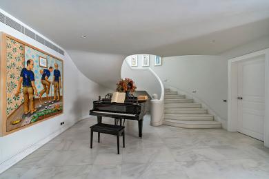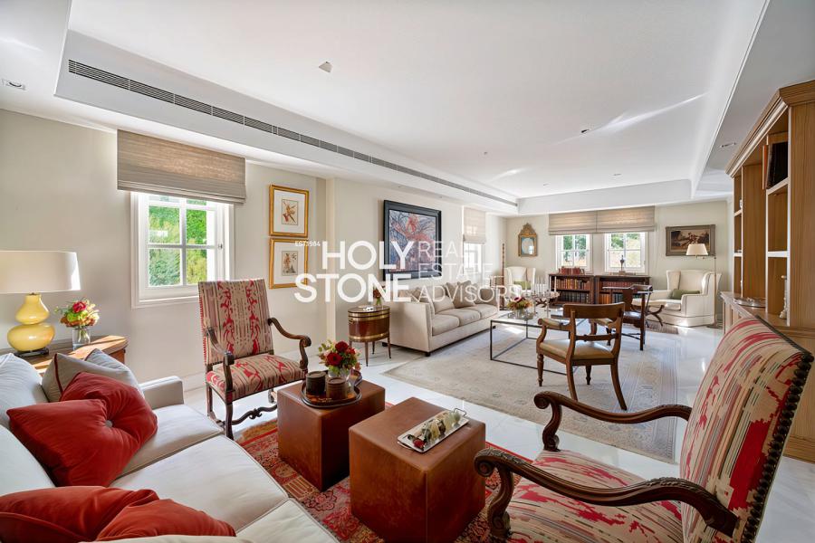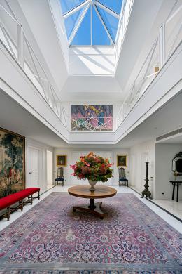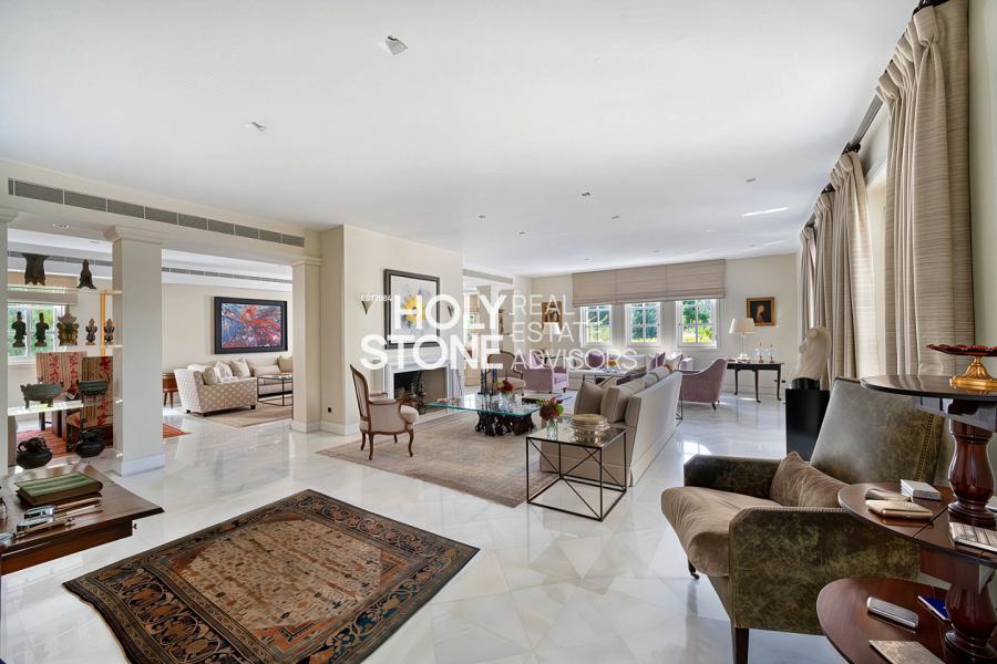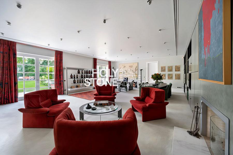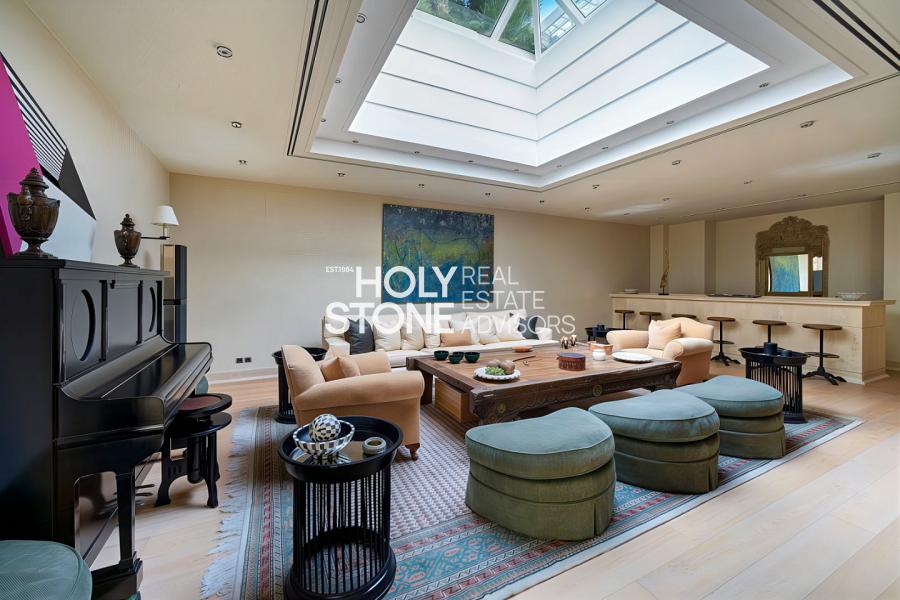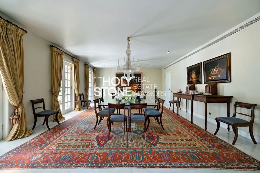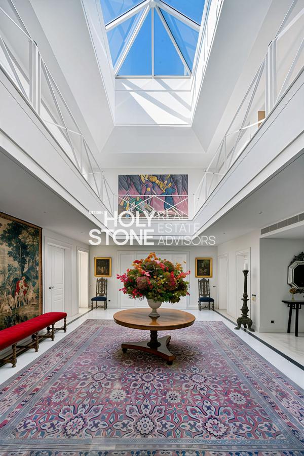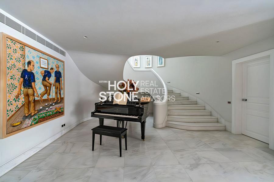 Η είσοδος οδηγεί σε ένα εντυπωσιακό, πλημμυρισμένο από φυσικό φως φουαγιέ, φωτιζόμενο από επιβλητικό φεγγίτη. Το ευρύχωρο καθιστικό με το επιβλητικό τζάκι προσφέρει αίσθηση μεγαλοπρέπειας και άνεσης. Σε άμεση γειτνίαση βρίσκεται η πλήρως εξοπλισμένη κουζίνα υψηλών προδιαγραφών, με έναν κομψό χώρο πρωινού.