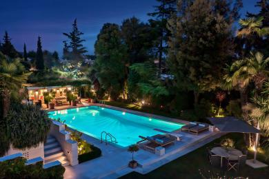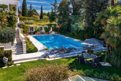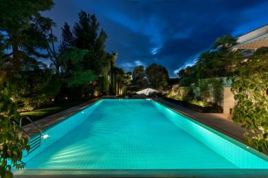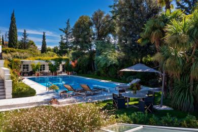 Ο προσεκτικά συντηρημένος κήπος, περιτριγυρισμένος από ώριμη βλάστηση, φιλοξενεί μεγάλη εξωτερική πισίνα καθώς και ανεξάρτητο pool house, ιδανικό για στιγμές χαλάρωσης, φιλοξενίας και αναψυχής με απόλυτη ιδιωτικότητα.